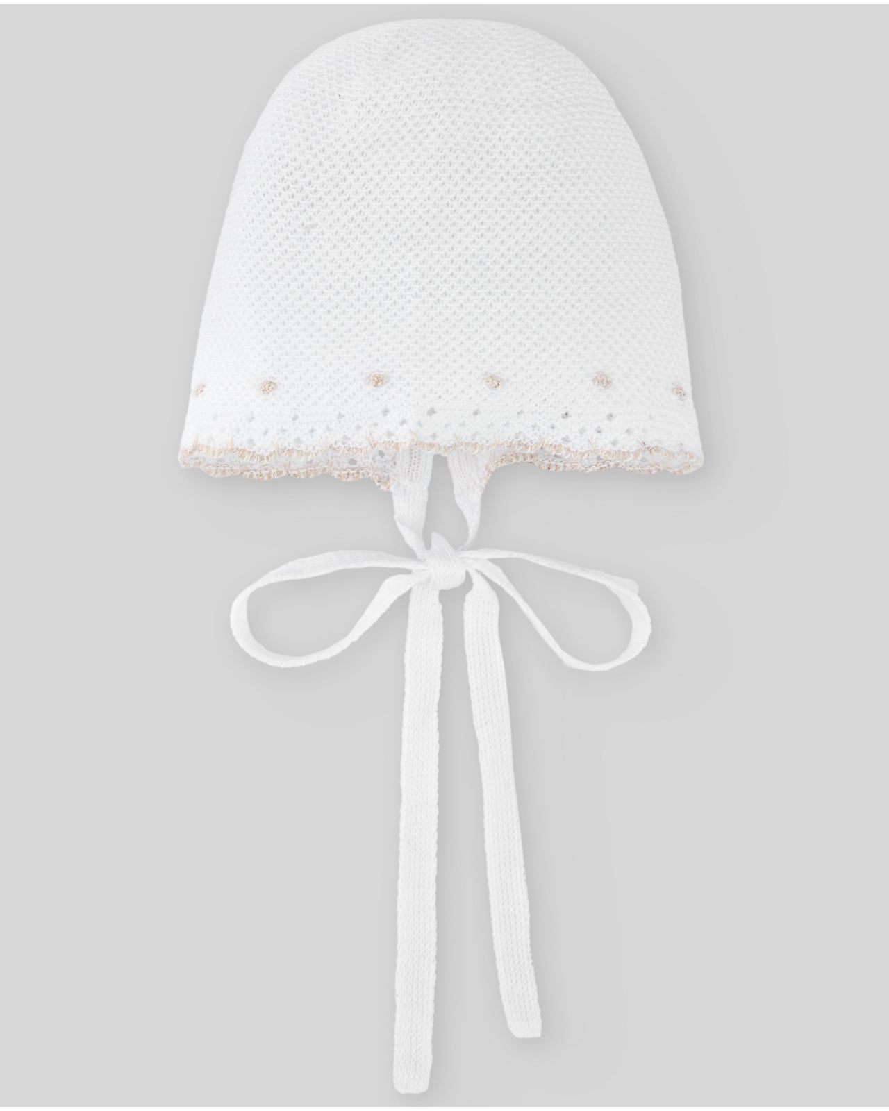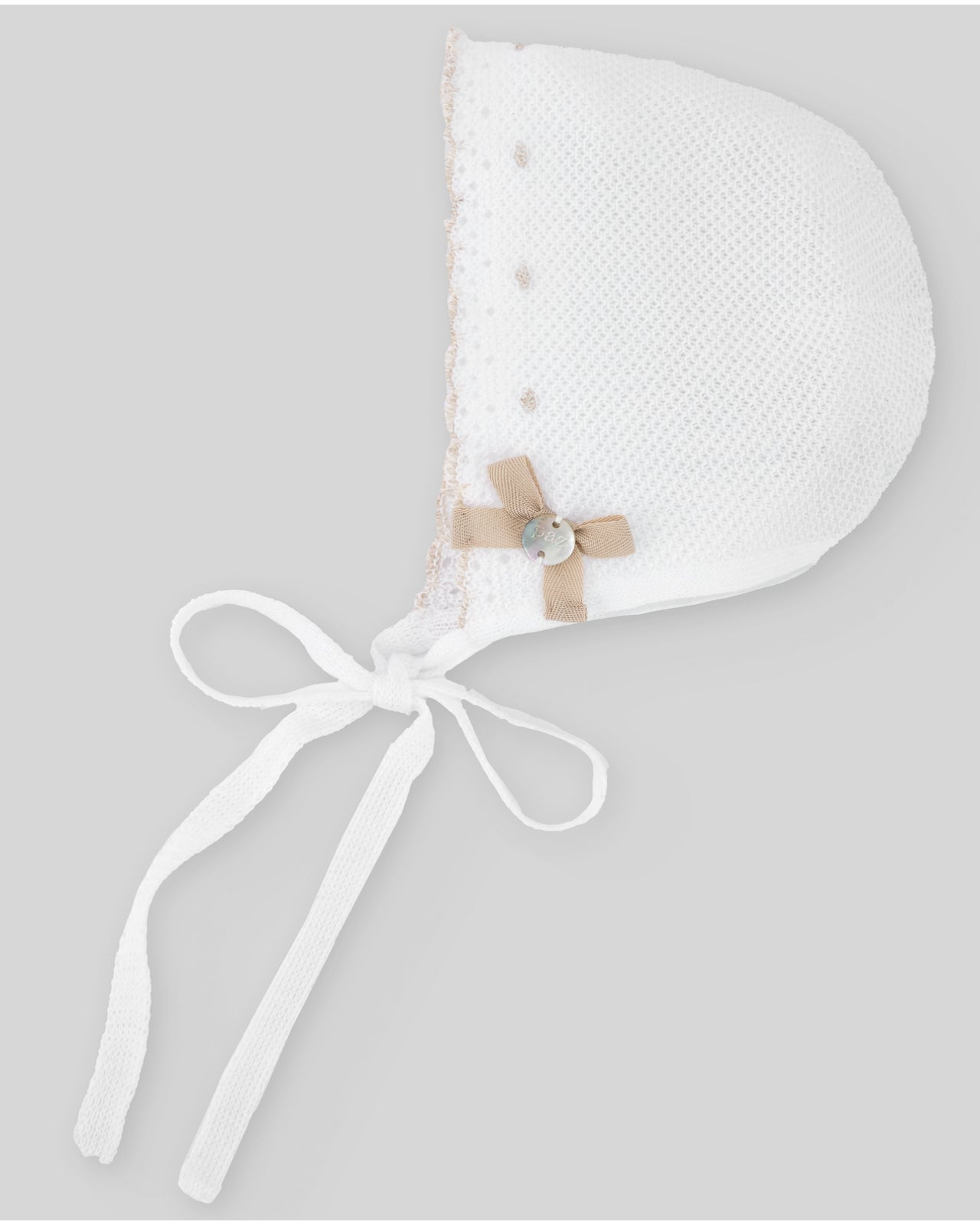 Textured knit baby bonnet with bobble details and contrasting scalloped trim. Ribbon tie in fabric with a PAZ mother-of-pearl tag. Adjustable cords. Complements the LINO collection beautifully.
