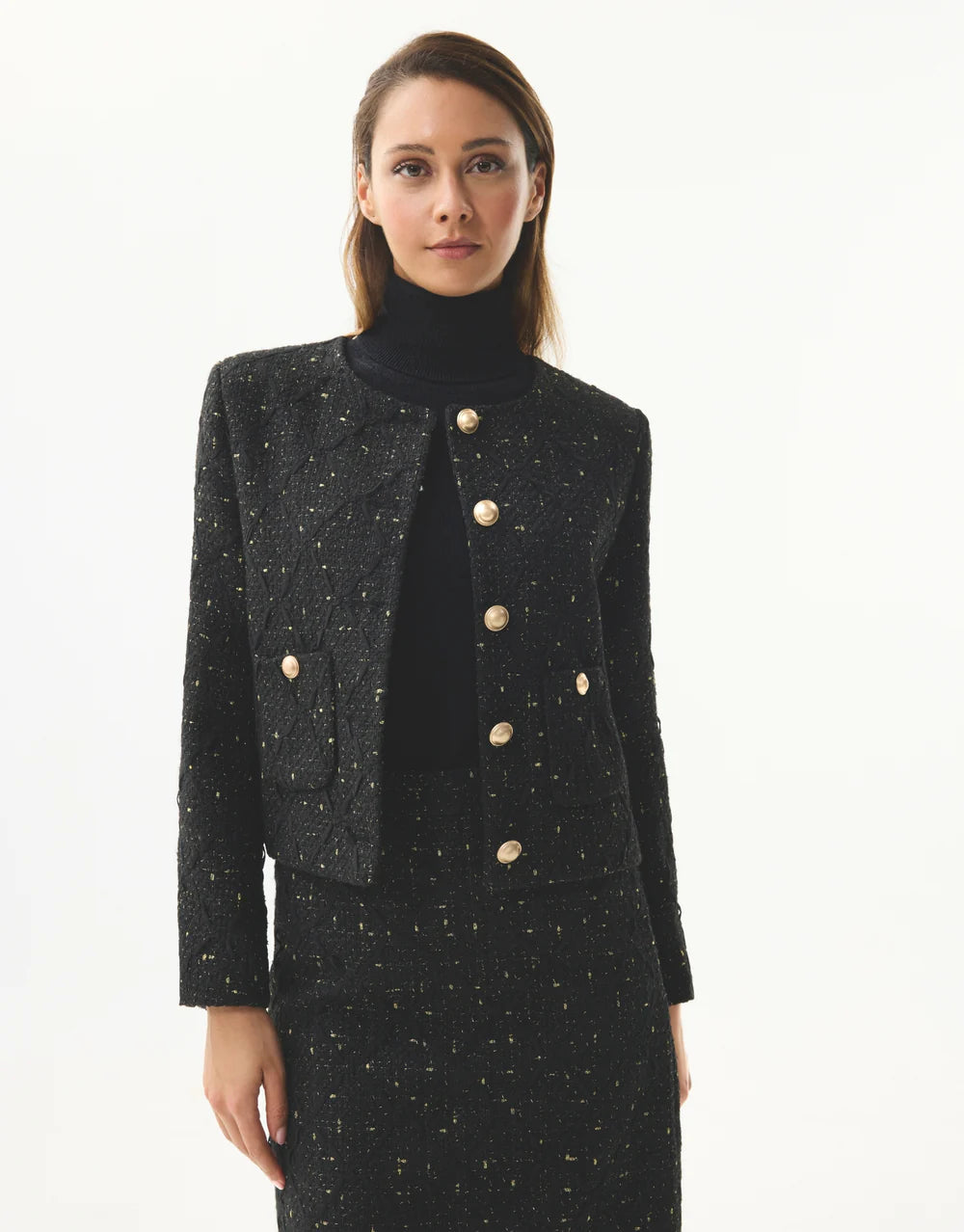 Chic and timeless, the short jacket and skirt LORENE captivates with its straight cut and elegant textured fabric highlighted by golden buttons. Inspired by the tailored style ,its round collar and meticulous finish make it a key piece in the women's wardrobe. Available in black and ecru.