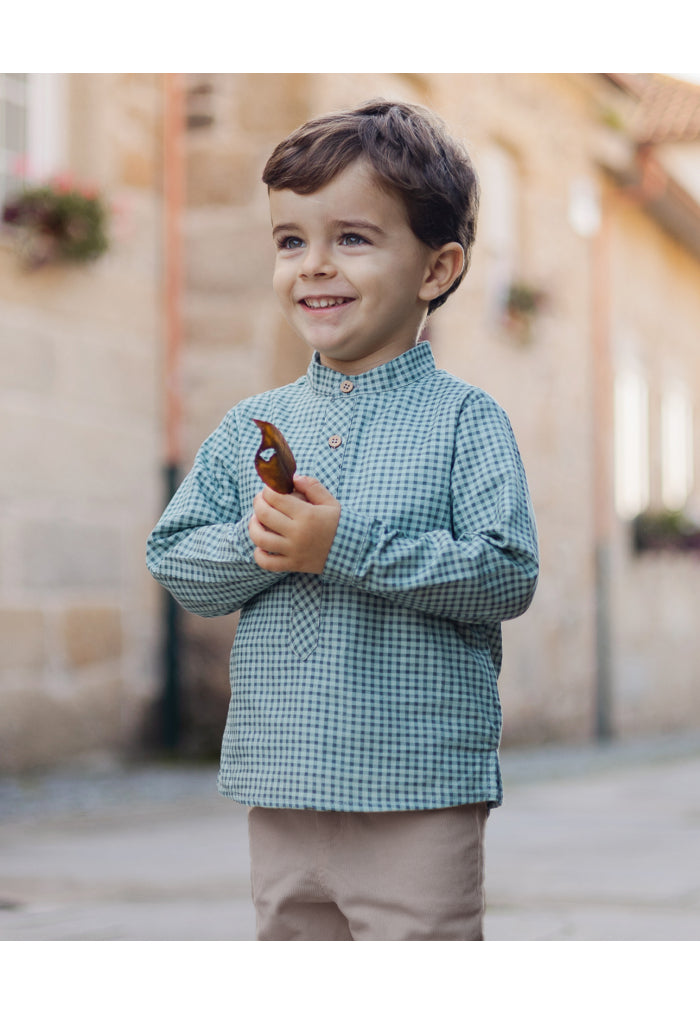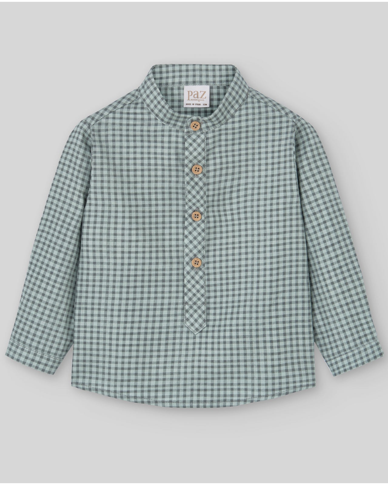 Get your little one ready for a stylish day with the Maravillas checkered shirt. Made with soft Vichy fabric, this shirt features a trendy mandarin collar, front button closure, and unique wooden button details on the sleeves. Perfect for any occasion, dress your child to impress with this chic shirt!