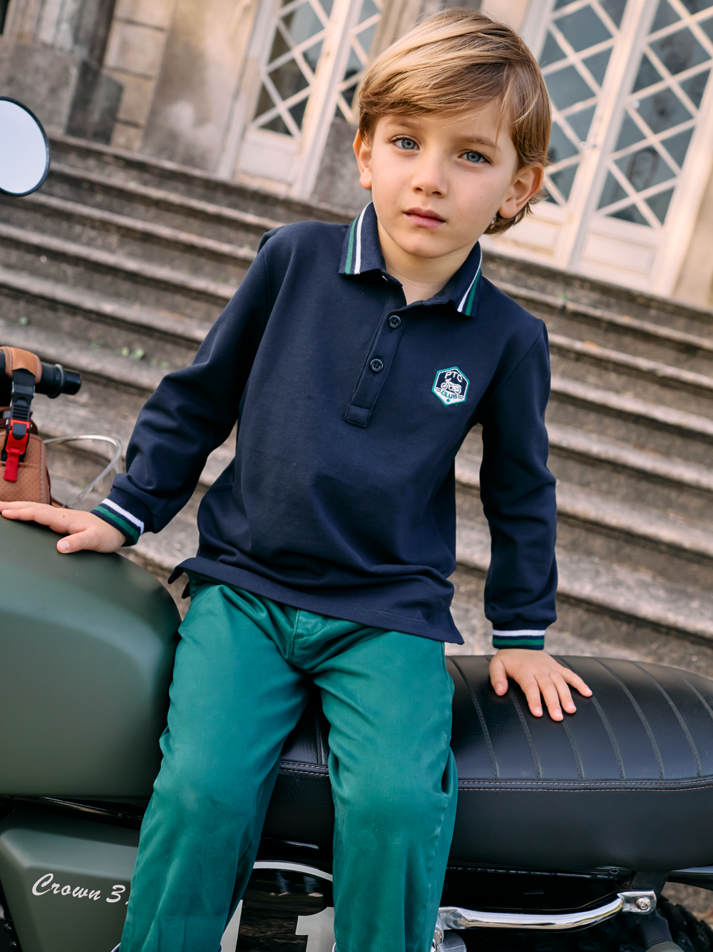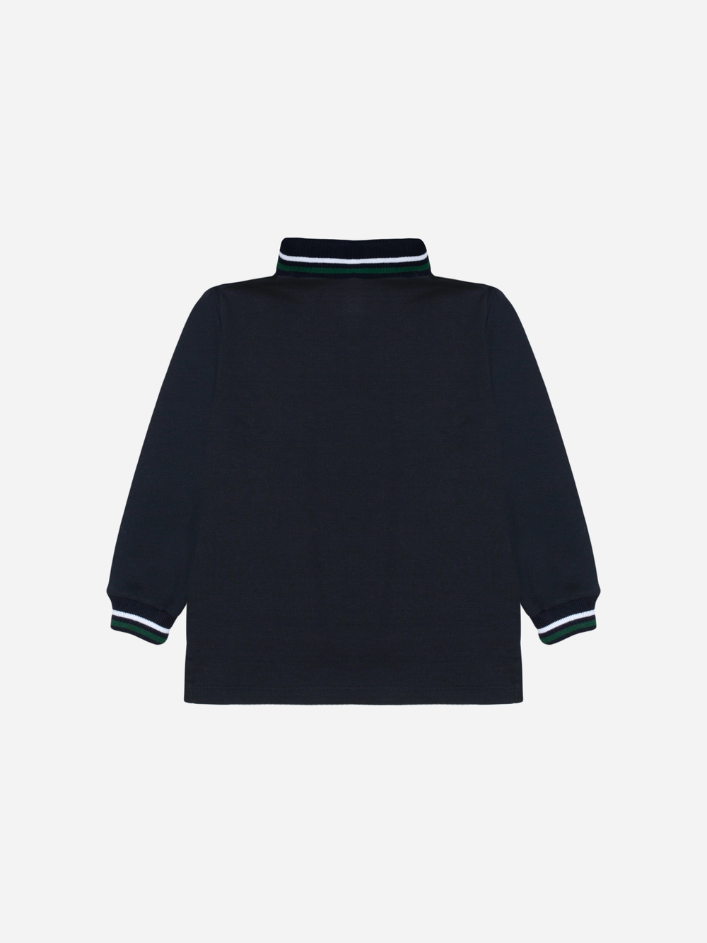 This smart marine long-sleeved polo shirt is crafted from comfortable piquet fabric. It features a stylish collar and cuffs with green and white stripe detailing, a classic button placket, and an embroidered crest on the chest, offering a polished and sporty look.