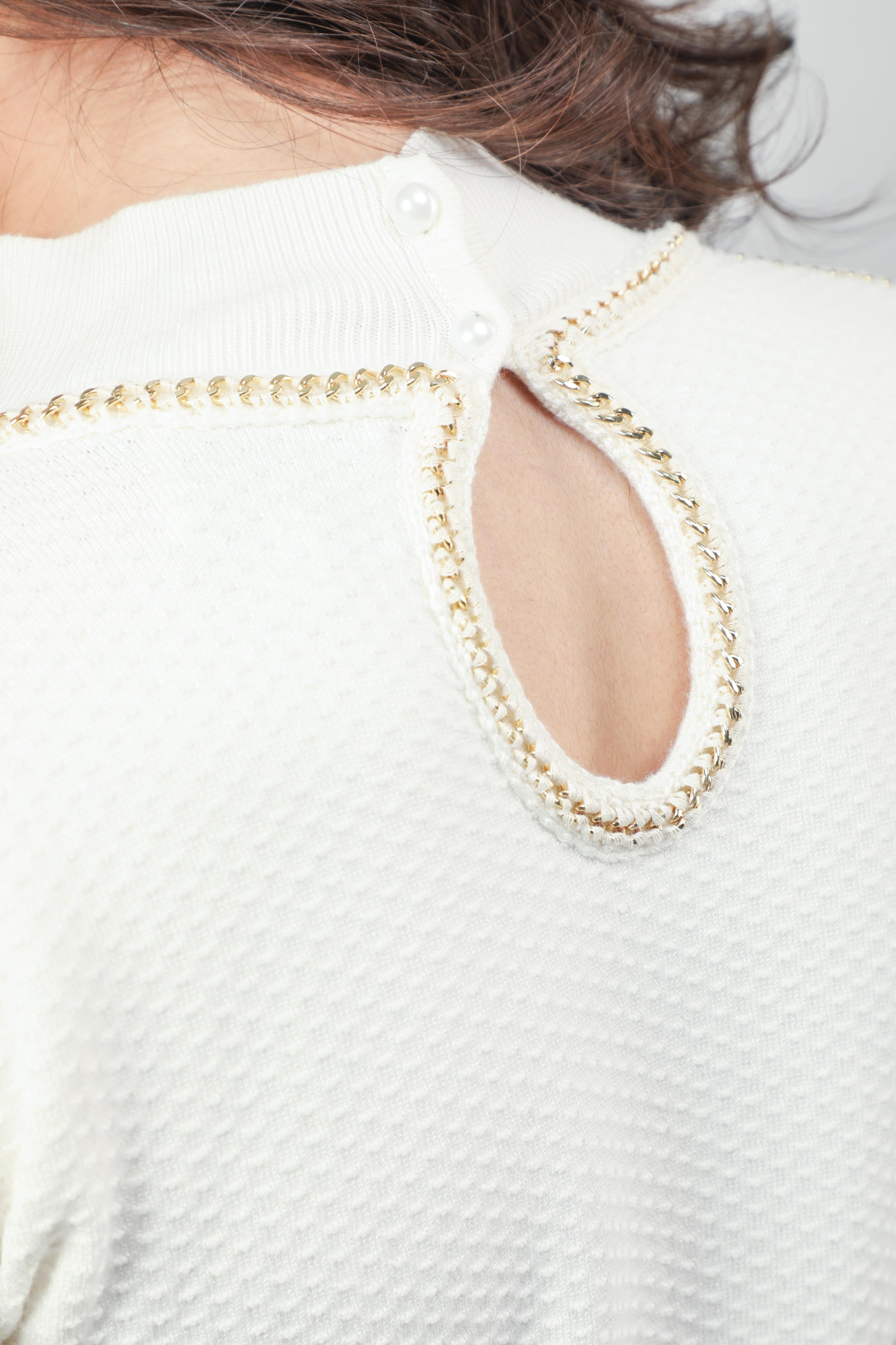 A luxurious white sweater featuring a fine textured knit and a refined mock-neck design. Delicate gold chain detailing adorns the collar, sleeve seams, and a subtle back keyhole cutout, secured by pearl-accented buttons. The tailored silhouette and elegant accents elevate this piece, making it ideal for sophisticated day-to-evening wear.