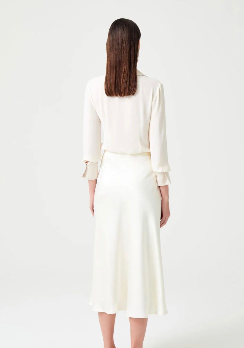 This is an elegant, monochromatic look featuring a classic button-down shirt in a light, neutral shade, likely ivory or cream, crafted from a luxurious, fluid fabric like silk or a quality crepe, giving it a subtle sheen and beautiful drape. The shirt features a traditional soft-point collar, a clean front placket with tonal buttons, and appears tailored through subtle vertical seams, suggesting a fitted or semi-fitted silhouette. It is styled tucked into a matching high-waisted satin skirt, creating a sophisticated and minimalist ensemble suitable for professional or formal occasions.