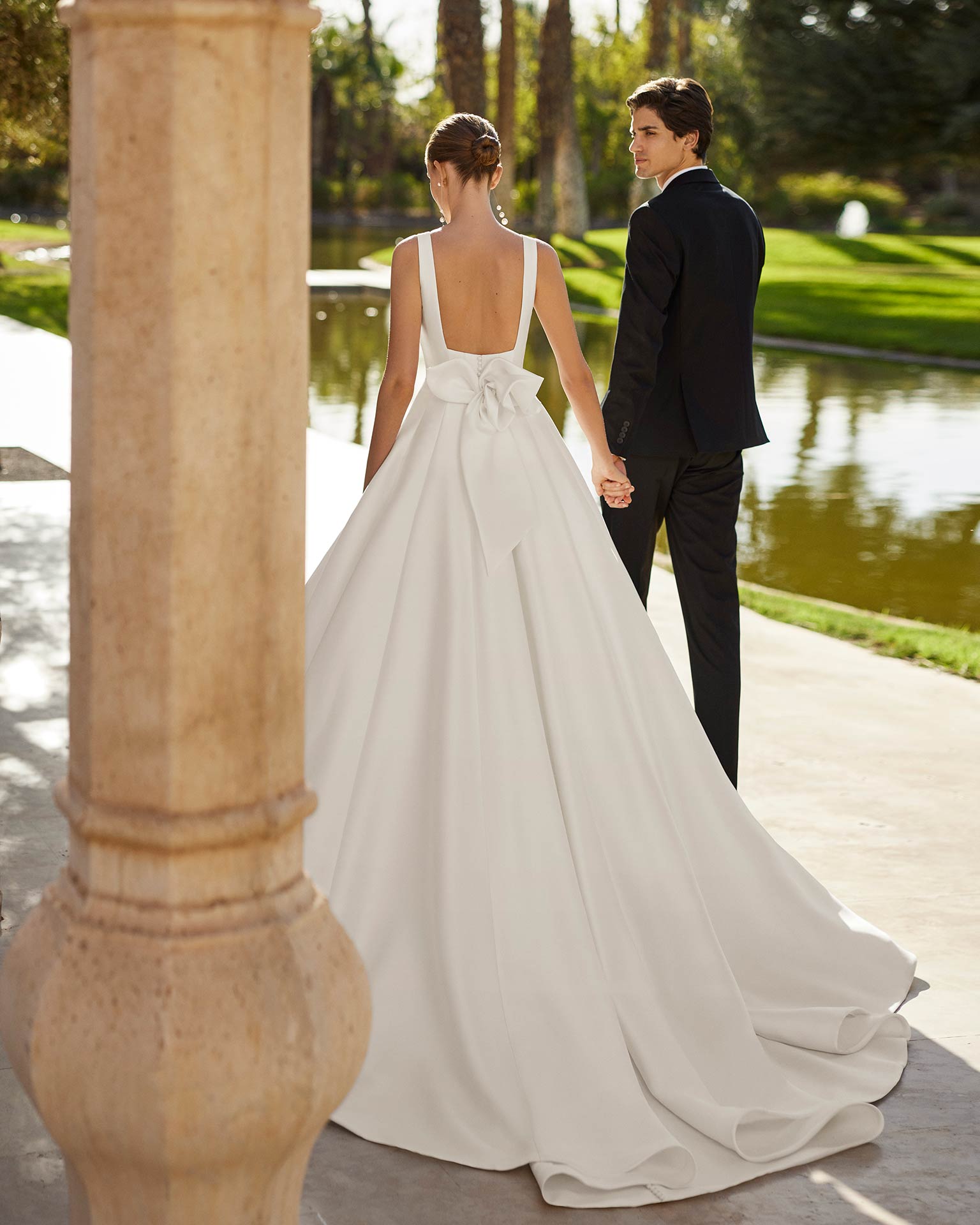 Long voluminous wedding dress. Made of sienna fabric with bateau neckline, straps, open back, and bow detail.