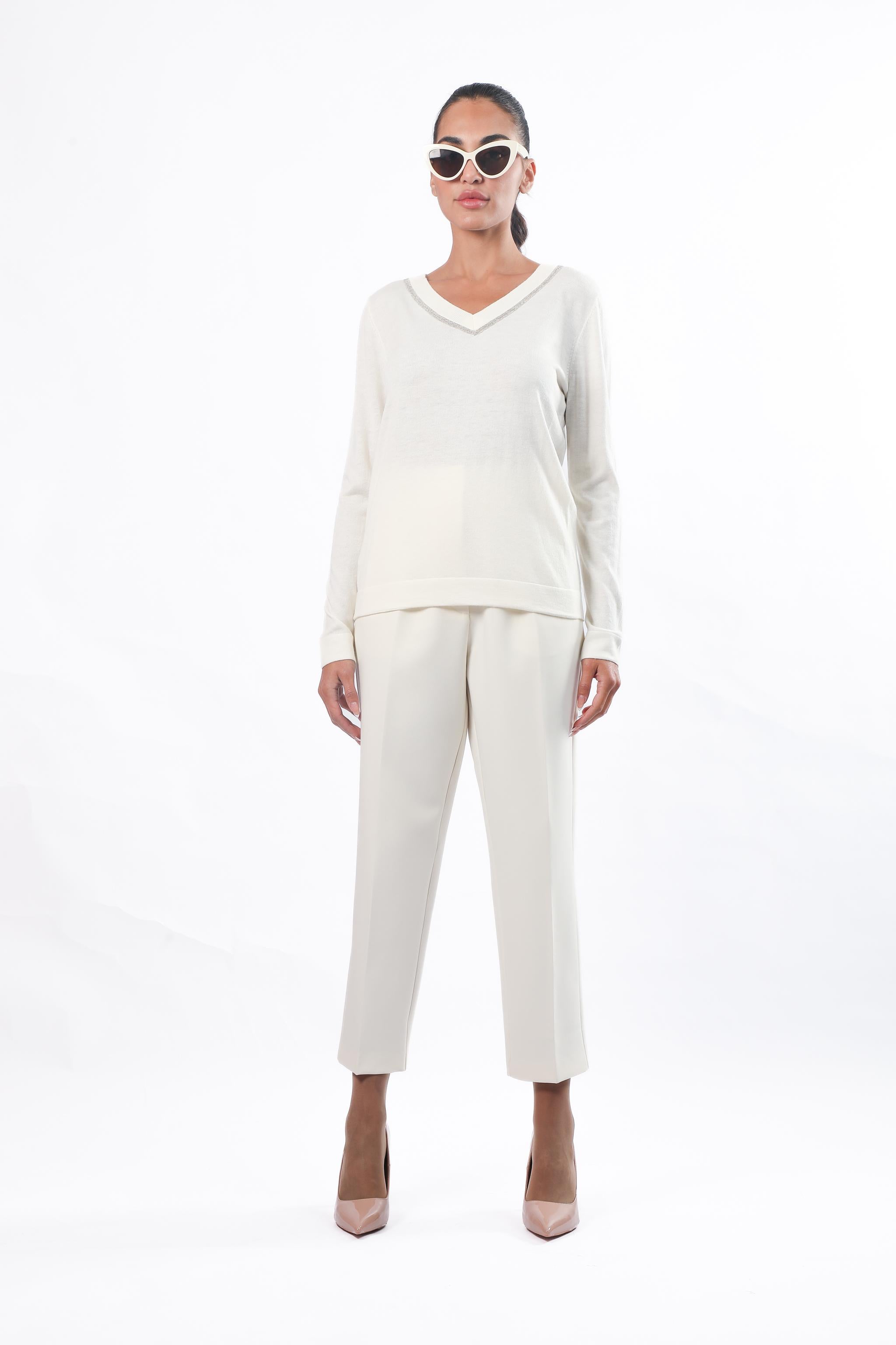 Embrace effortless comfort with this off-white, drop-shoulder sweater. Crafted in a relaxed, oversized silhouette, it features subtle seam details across the arms and a gently rounded neckline for a minimal yet modern look. Wear it with your favorite denim or style it up with sleek trousers—this versatile piece is perfect for laid-back days and sophisticated evenings alike.