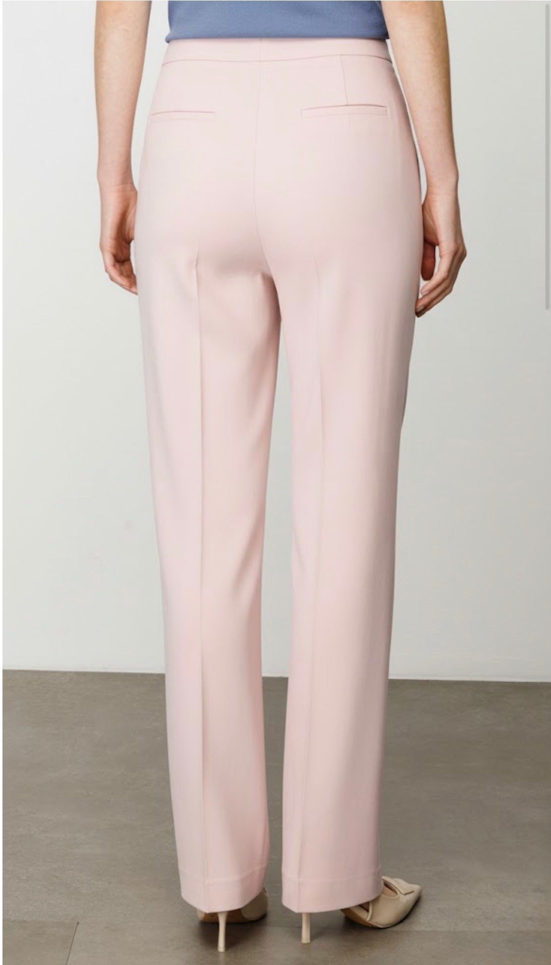 These are straight-leg trousers in a pale pink or blush color. They feature a smooth, tailored fit with a flat front, subtle center creases down the legs, and a hook-and-bar closure. The fabric appears to be a lightweight suiting material that drapes nicely, suggesting they are comfortable yet polished enough for professional or dressy wear.