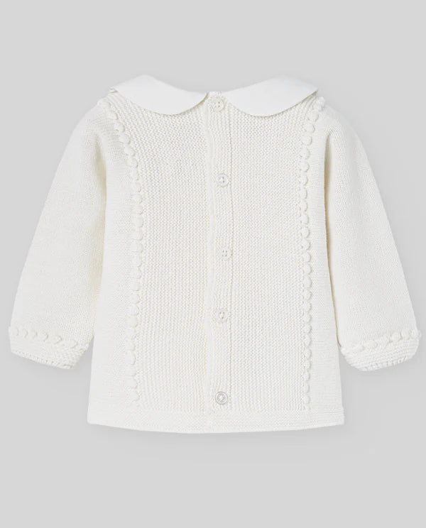 Long-sleeved baby wool sweater in a warm knit with a center panel in a worked stitch and raised side edges. A smooth baby collar and two decorative buttons on the front. Bobble stitch cuffs and a back closure for added comfort. A neat and cozy piece, perfect for seasonal coordinated outfits from Paz Rodriguez fw 2025 collection.