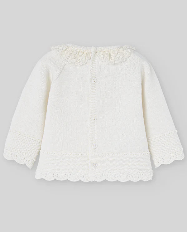 The product Set composed of top and Trousers The Paz Rodríguez white lace baby girl's dress is available on the RubinoKids.com online store. Made of 100% wool, it features a white color, a lace collar, a knit fabric, a scalloped hem, a button closure, and feet. Available in various sizes, it is part of the Paz Rodríguez Fall/Winter 2025 collection