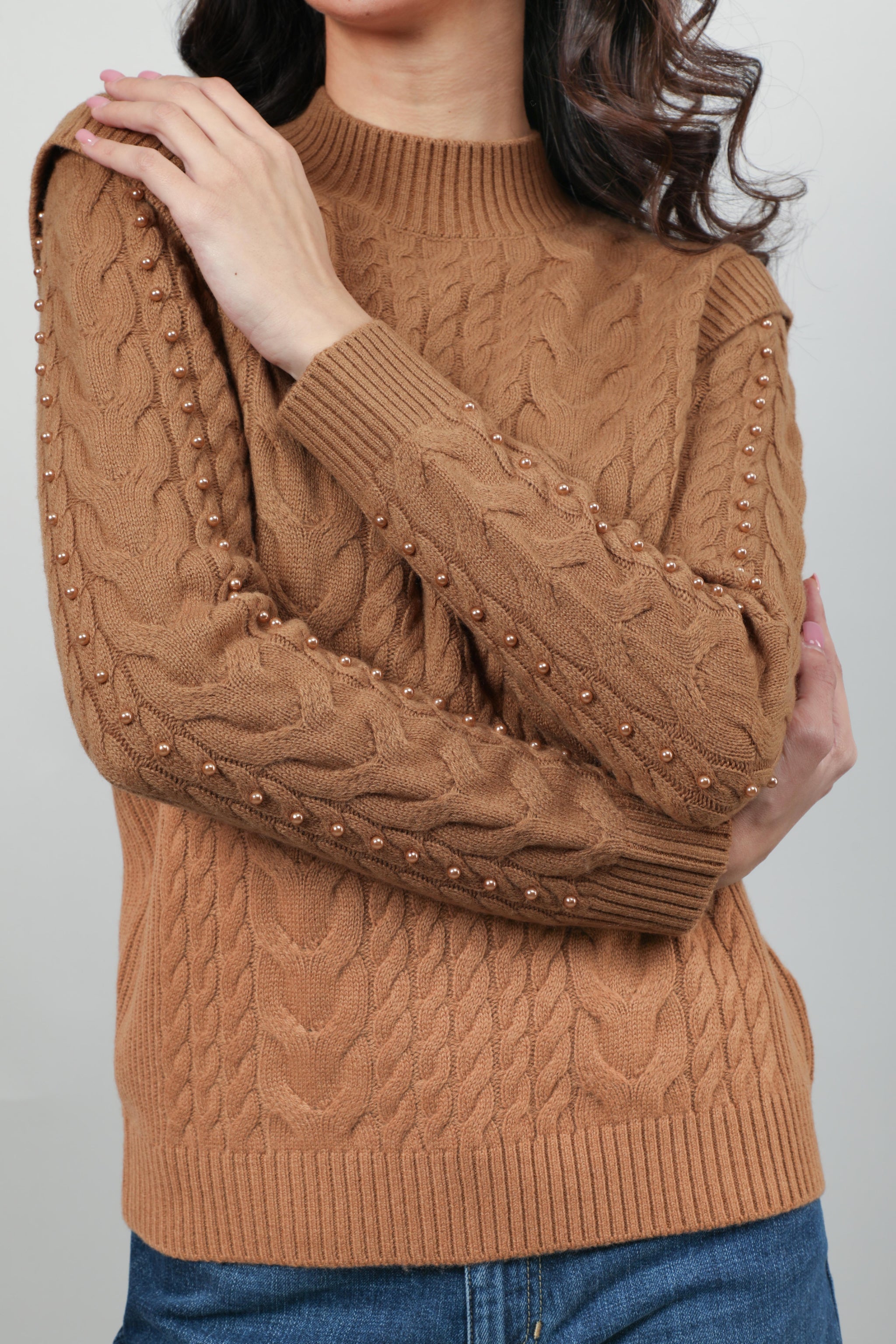 Wrap yourself in cozy elegance with this off-white cable knit sweater. A refined mock neckline and ribbed trims create a classic shape, while the pearl accents on each sleeve lend an elevated, feminine touch. Pair it with jeans for a laid-back afternoon or style it with a skirt for an effortlessly polished