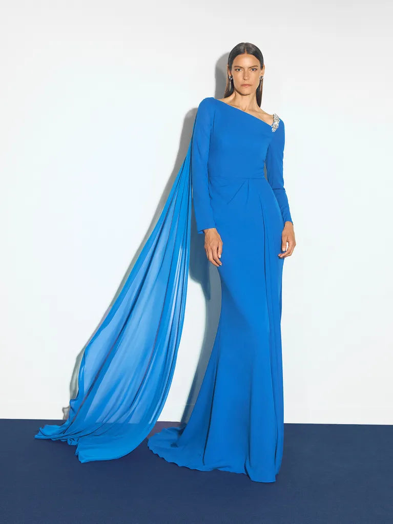 This elegant mermaid evening dress boasts long sleeves and is made of luxurious georgette fabric. Perfect for any formal event, this dress combines comfort and sophistication effortlessly. Stay stylish and comfortable all night long with its unique design and high-quality material.