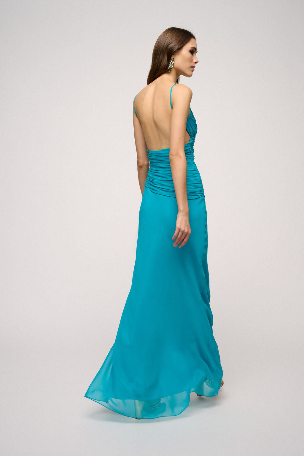 Elegant silk dress featuring gathered cross-over bodice, adjustable skinny straps, slit enhanced with draping. Knee-length. Regular fit.