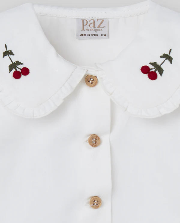 Blouse for girl with long sleeves, crafted in soft cotton fabric with embroidery detail on the front and delicate scalloped lace at the neckline by Paz Rodriguez.