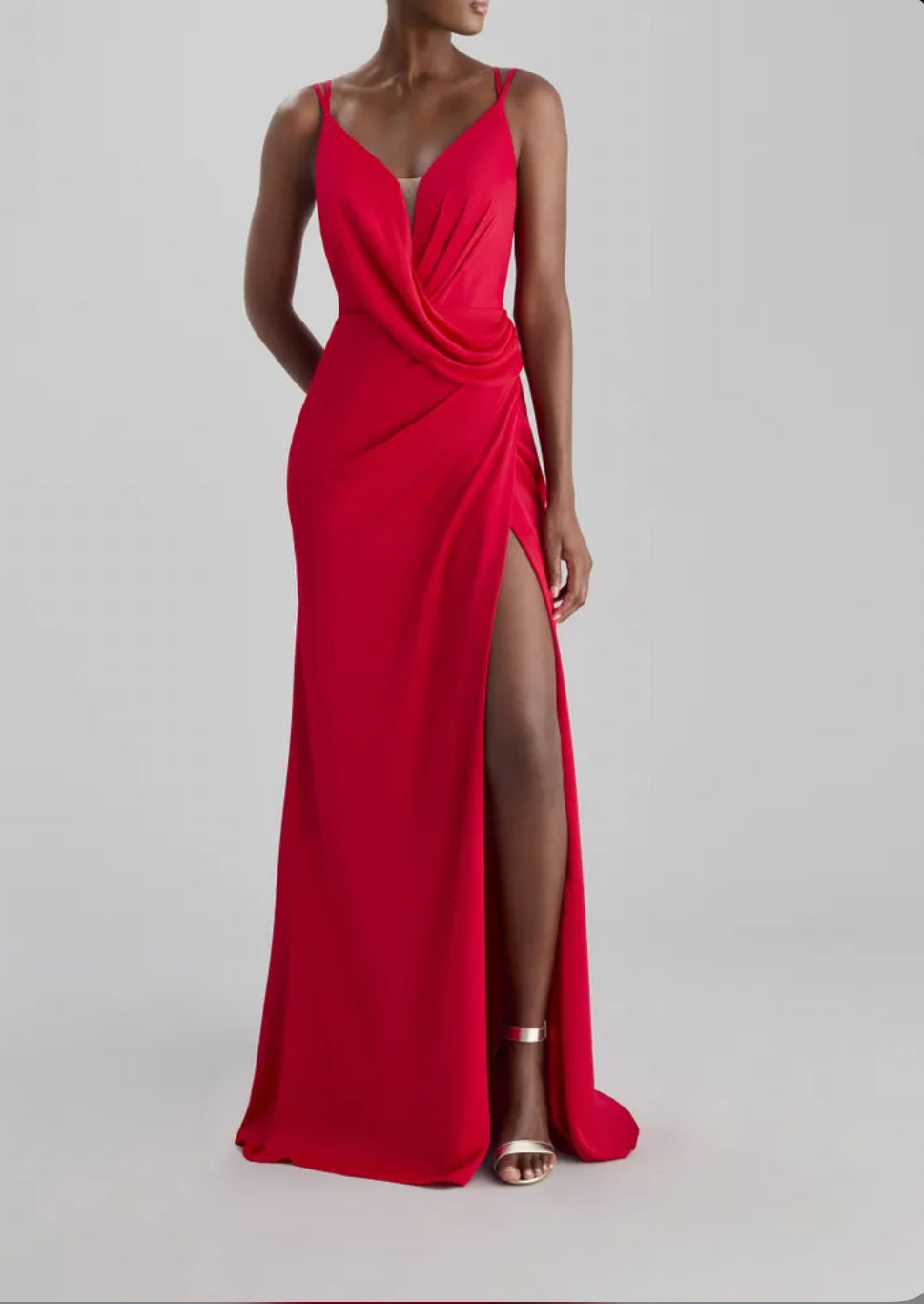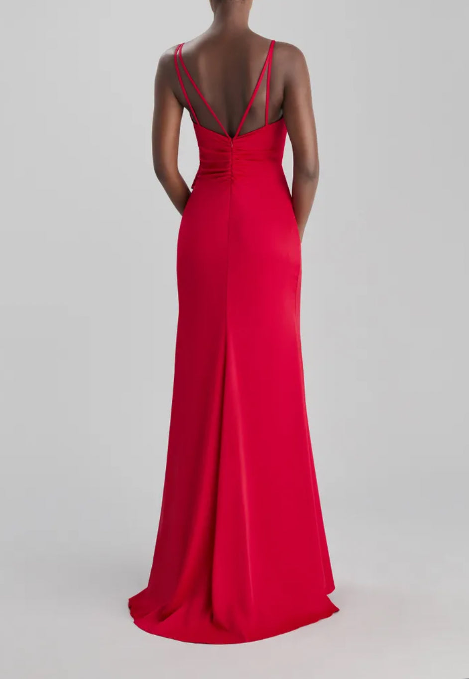 Discover the epitome of sophistication with the Pronovias Satin Mermaid Gown . This stunning dress is designed to highlight your figure with its sleek , curve-hugging silhouette . The elegant V-neckline and bold V-back create a captivating balance of classic and modern style . Crafted from luxurious satin, this sleeveless gown is perfect for making a lasting impression at any formal event .