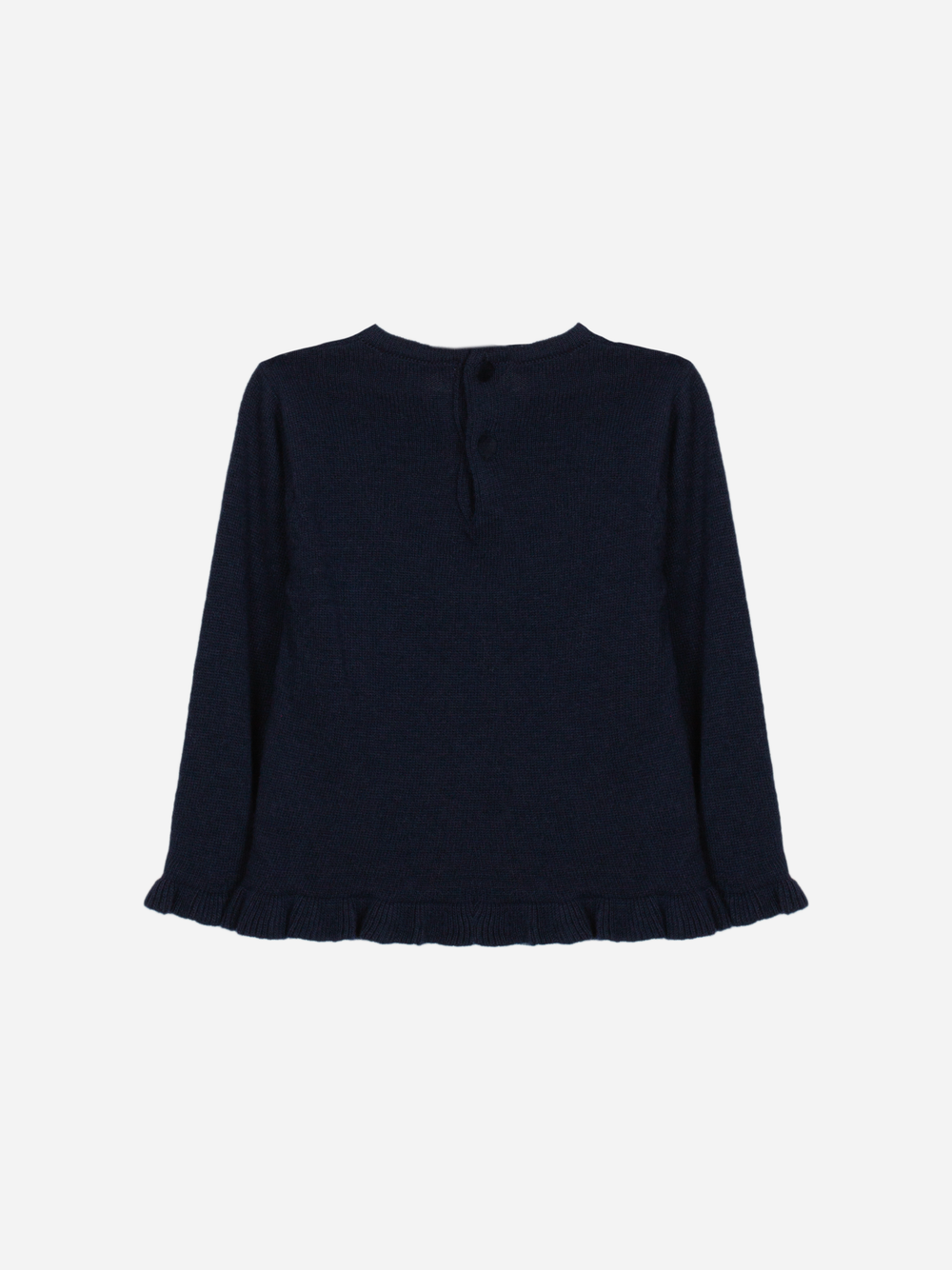 This charming long-sleeved marine knit sweater features an adorable embroidery of a golden retriever puppy wearing a red beret and a patterned scarf. The sweater has a crew neck and sweet ruffled detailing at the cuffs and hem, adding a playful touch to this cosy piece.