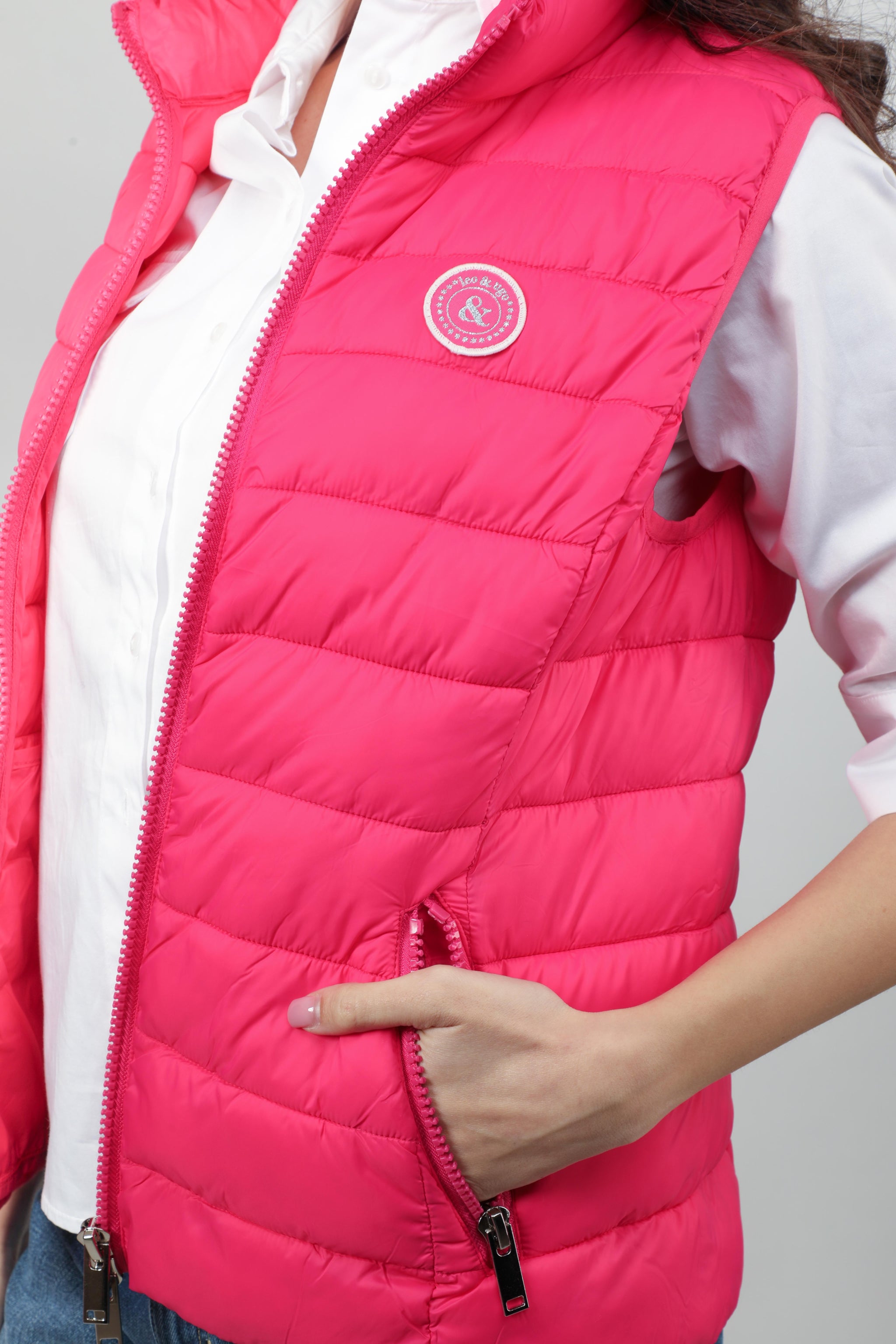 A vibrant pink, lightweight vest designed with horizontal quilted stitching and a cozy stand collar. Featuring a zip-front closure and two side zip pockets, it’s perfect for adding a sporty pop of color to any casual outfit. A small logo patch on the chest enhances its playful, contemporary style. Wear it layered over a crisp white shirt and jeans for a fresh, everyday look.