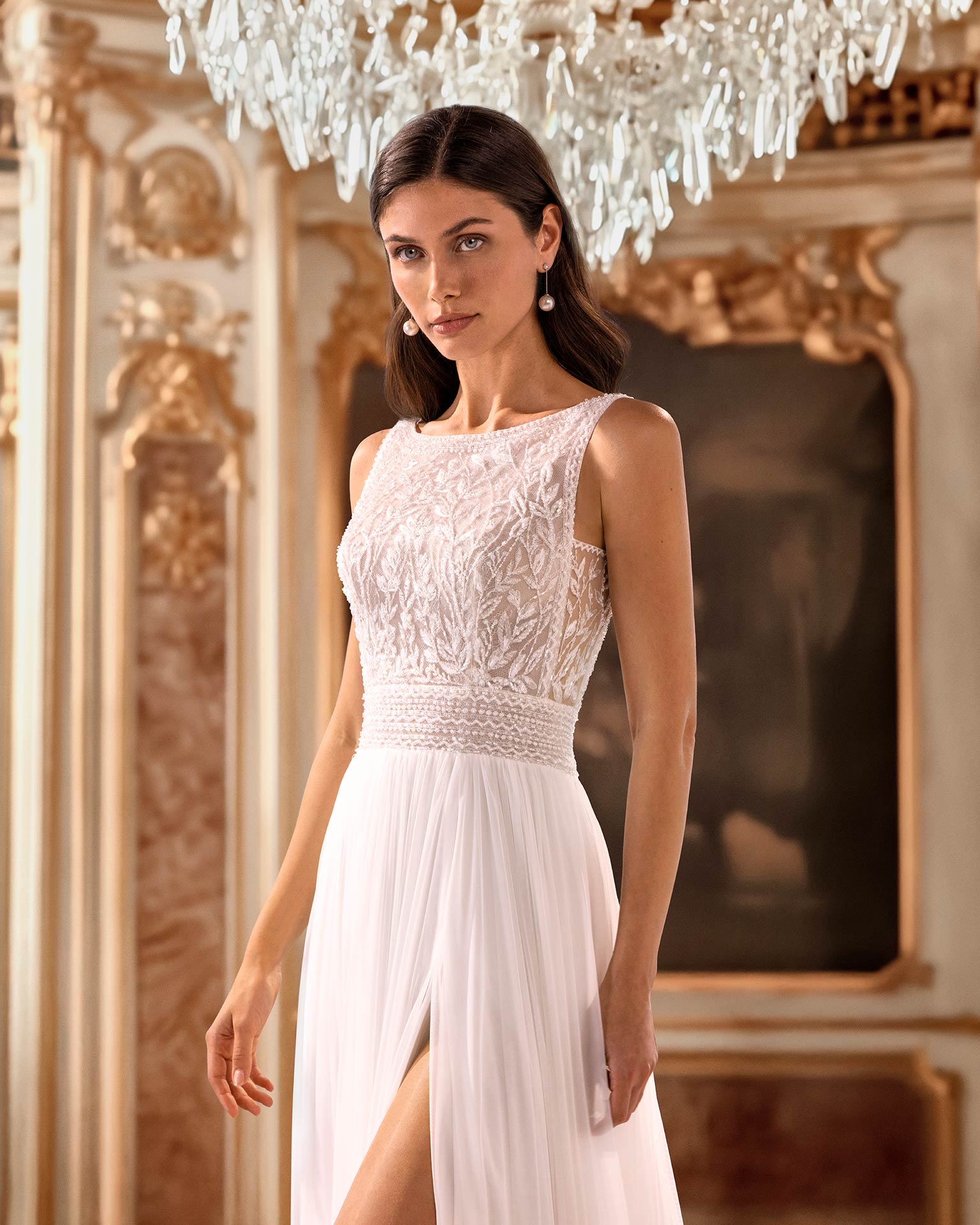 A-line wedding dress in muss with lace and beading. Boat neckline and square back. With skirt featuring a side slit.
