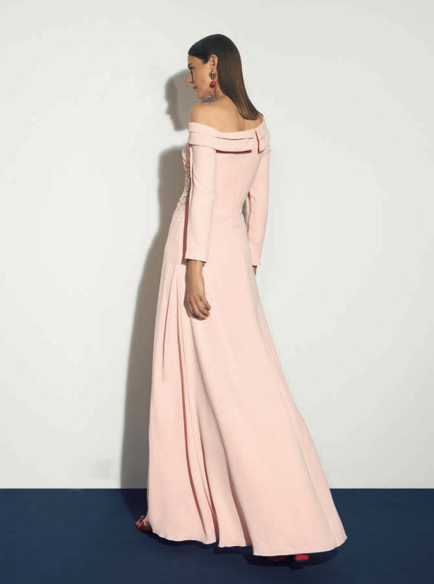Soft elegance meets modern edge — a blush off-shoulder gown with sculpted draping and radiant detailing, perfect for a statement evening.