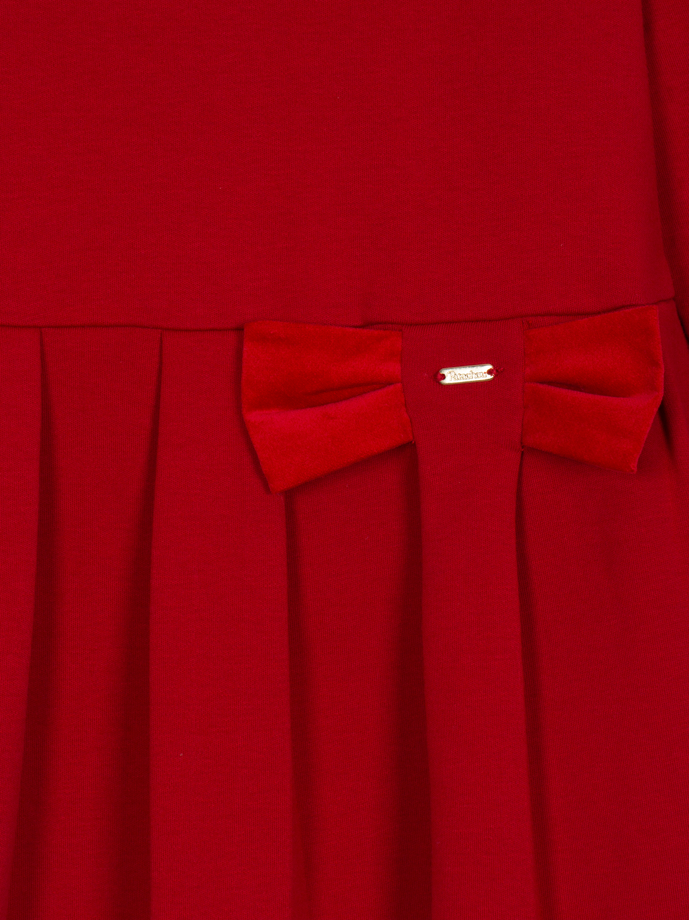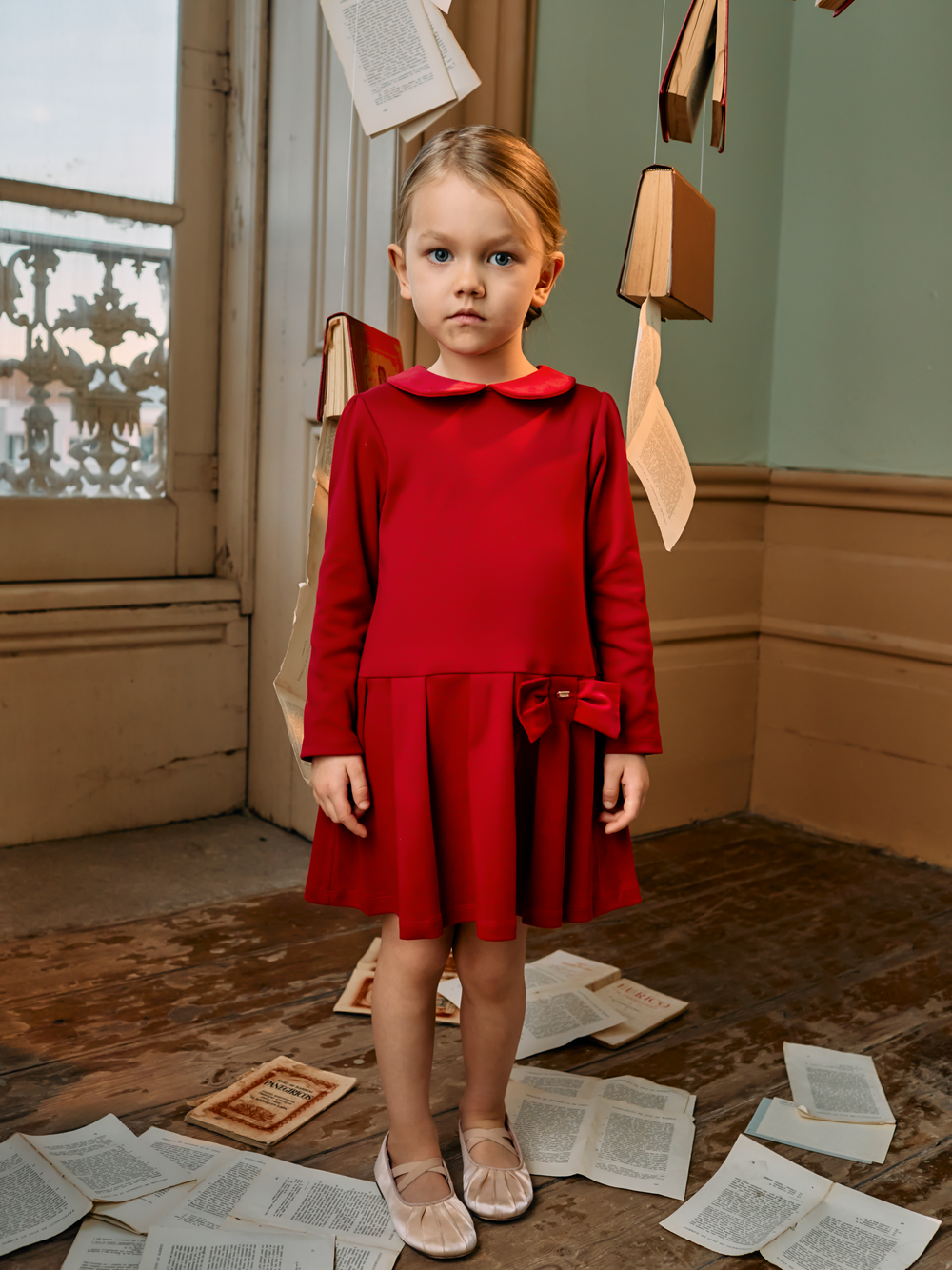 This festive red long-sleeved dress is made from soft interlock fabric and features a contrasting red velvet Peter Pan collar. The dress has a pleated skirt and is adorned with a large, matching red velvet bow at the waist, creating a charming and elegant look.