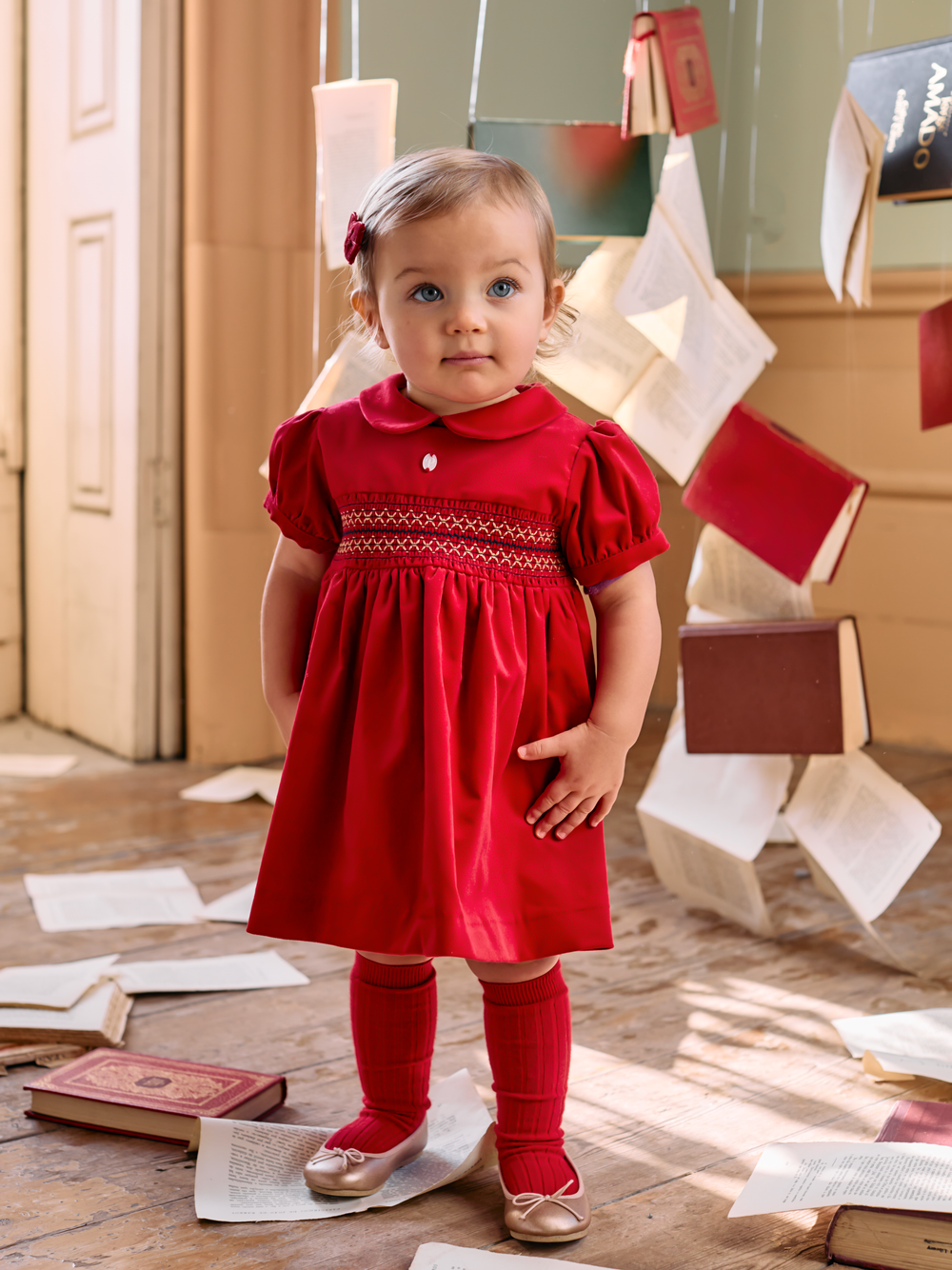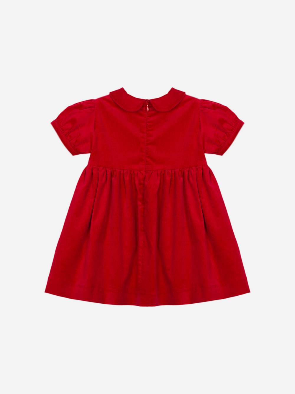 This festive short-sleeved red velvet dress features a charming Peter Pan collar and delicate smocking with intricate gold and red embroidery across the chest. The dress has a soft, luxurious feel and a classic silhouette, perfect for special occasions.