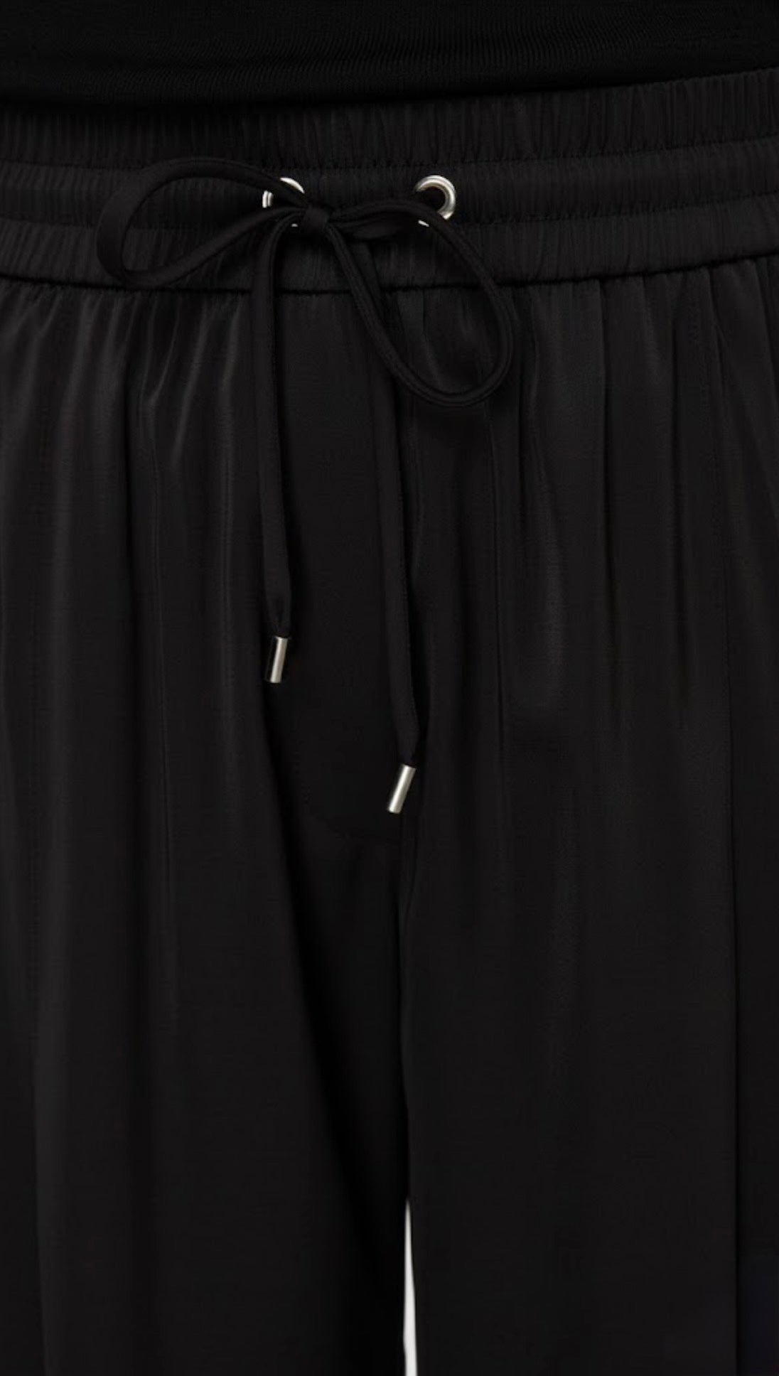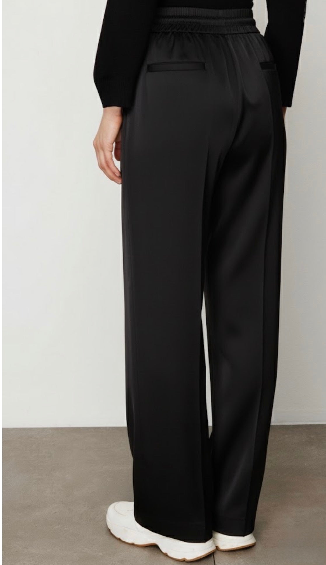 Crafted for both comfort and contemporary style, these black straight-leg trousers are a wardrobe staple. The relaxed silhouette offers a fluid drape, emphasized by subtle front pleats that create a refined vertical line. An adjustable elastic drawstring waistband ensures a perfect, easy-to-wear fit. Pair them with a silk blouse for a business-casual look or a simple knit for effortless weekend sophistication.