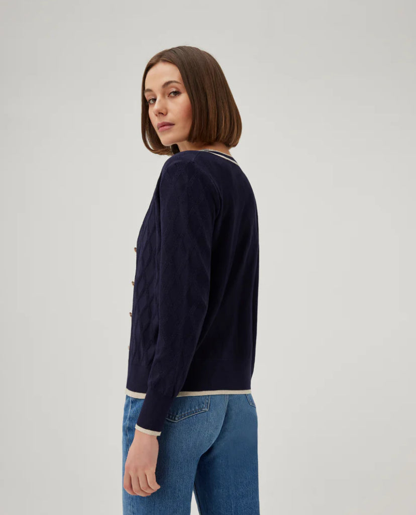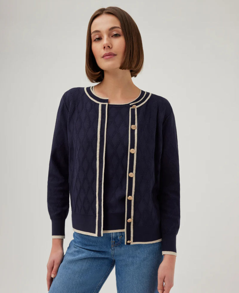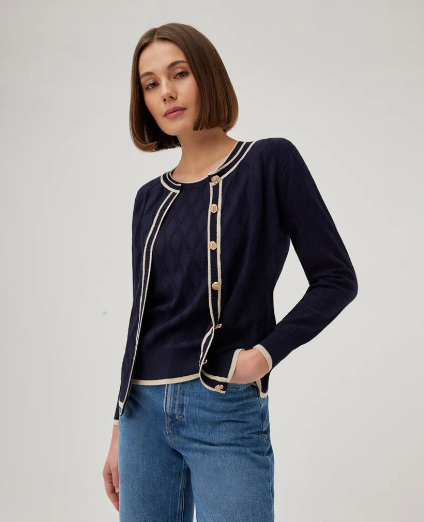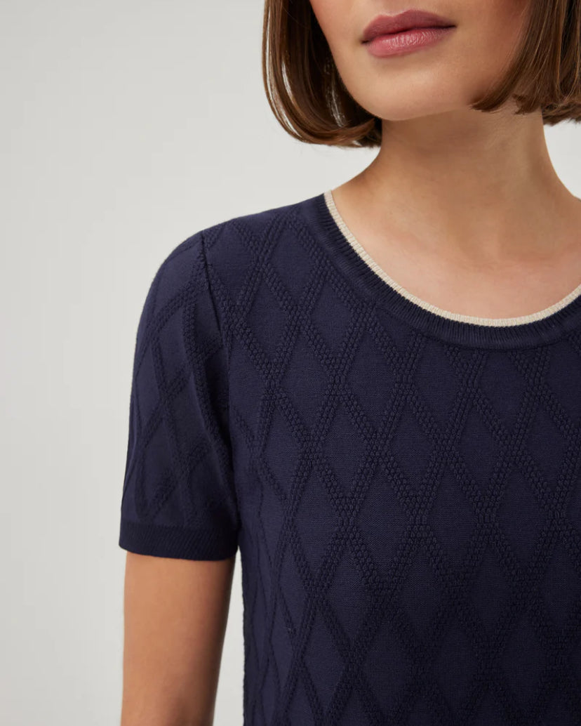 Embrace sophisticated elegance with the ROXY twin-set, available in fuchsia, navy blue, and ecru. Perfect for mid-season wear, this versatile t-shirt and vest combo allows you to layer or reveal as desired. The diamond patterns and golden buttons provide a refined touch, elevating your outfit for any occasion. A stylish choice that balances comfort and chicness effortlessly.