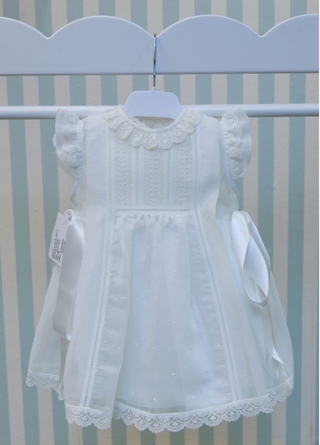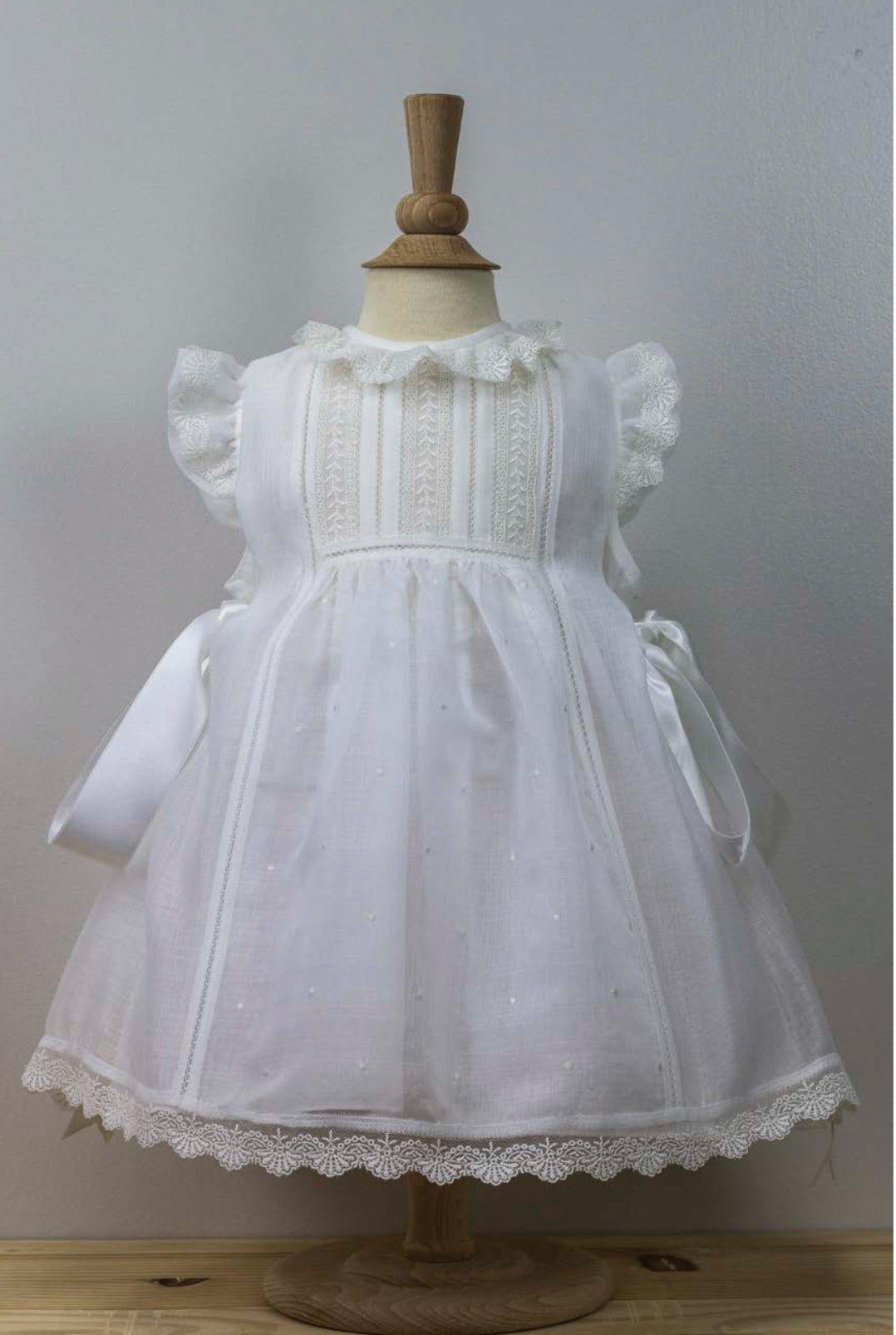 Grace your baby’s baptism with this exquisite Sleeveless Baptism Mantile . Crafted in delicate plumeti fabric , this mantile features elegant off-white sheaths and trim , offering a refined and timeless look . The sleeveless design ensures comfort , while the intricate detailing adds a touch of sophistication , making it a perfect choice for this important occasion . This mantile is ideal for creating a beautiful and memorable baptismal outfit .