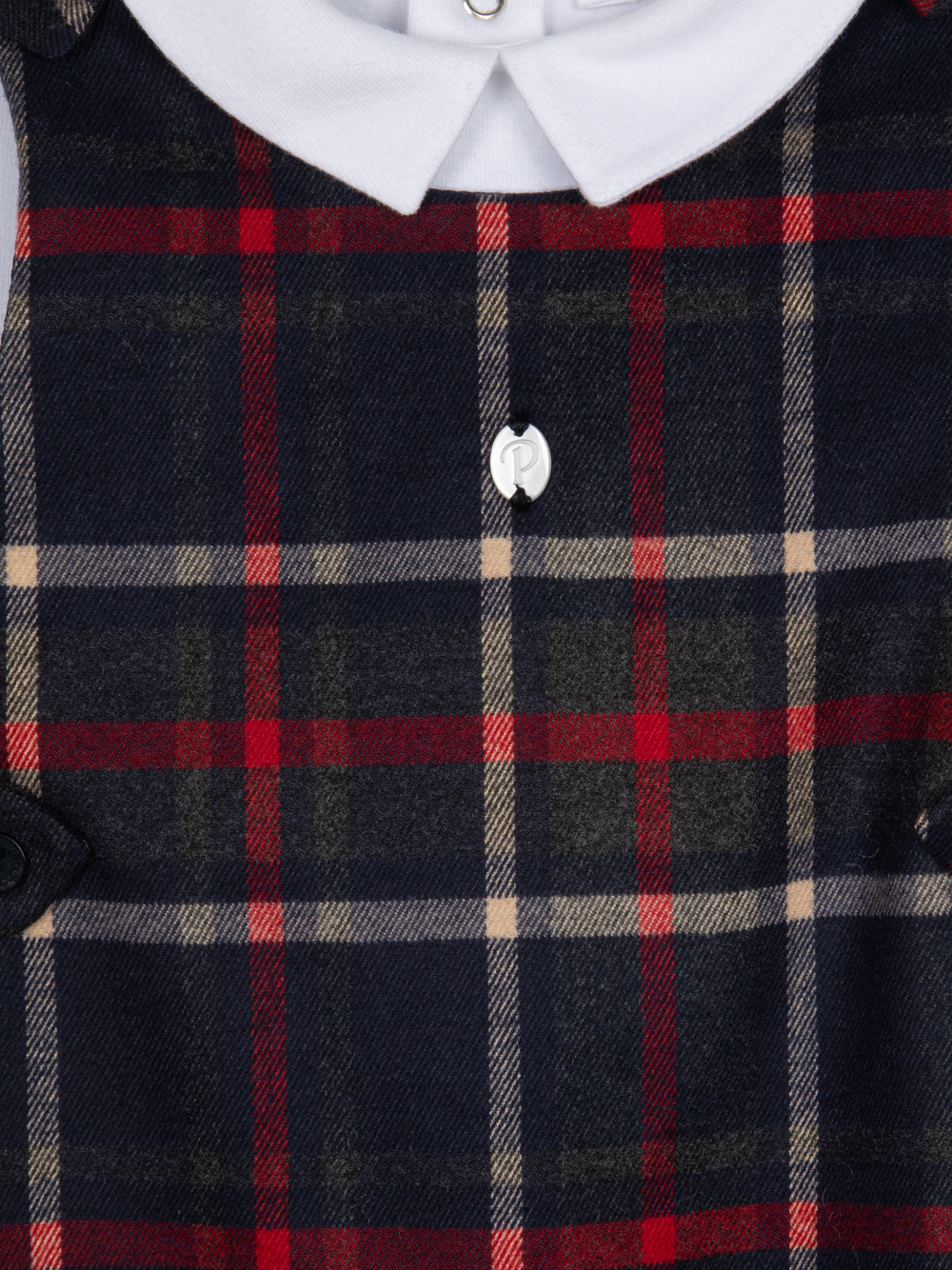 Lovely romper featuring tartan overalls and a long-sleeved white jersey shirt with a classic collared neckline.