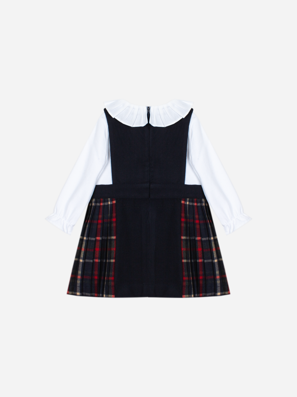 This charming two-in-one piece features a navy pinafore dress with tartan flannel accents at the sides and bow details, paired with a long-sleeved white jersey top with a ruffled collar. This outfit offers a blend of classic style and comfort.