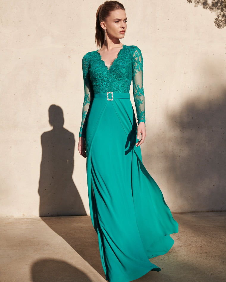 This elegant evening gown by Aire Barcelona combines classic sophistication with intricate detailing. Featuring a flattering V-neckline and long sleeves, the dress is adorned with delicate lace on the chest, intricately beaded to add a touch of sparkle. The lace detailing gracefully enhances the bodice, creating a romantic and refined look. Perfect for any formal occasion, this gown is a stunning choice for those seeking timeless beauty with a modern twist.