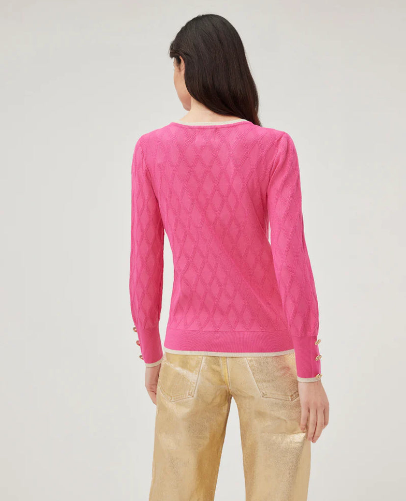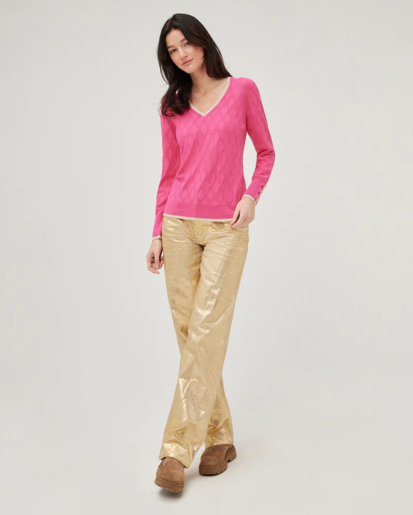 This V-neck Knitwear features a subtle diamond-knit pattern, adding texture and elegance to its classic design. The soft fabric offers comfort while the contrasting beige trim along the neckline and cuffs provides a refined touch. Stylish gold button accents adorn the cuffs, elevating the overall look. Perfect for adding a pop of color to your wardrobe, this sweater pairs beautifully with both casual and dressy ensembles.