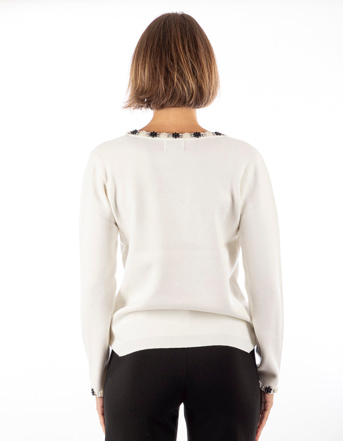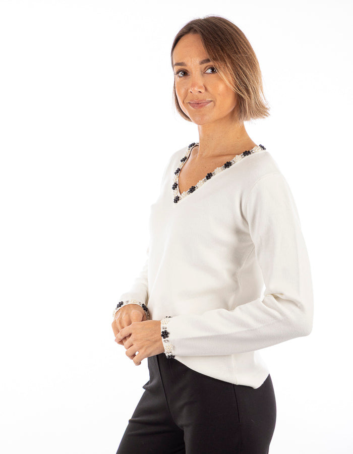 Refined long-sleeved sweater with a V-neckline. This model is distinguished by its delicate black and white pearls, meticulously sewn along the collar and at the bottom of the sleeves, bringing a touch of subtle and feminine elegance.