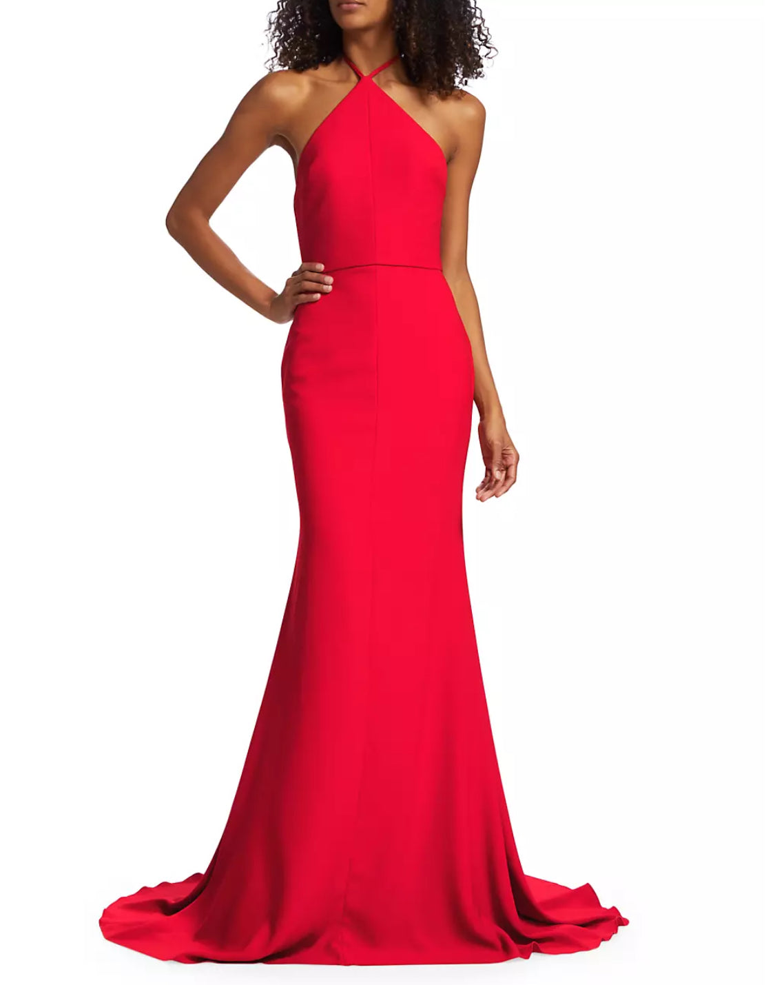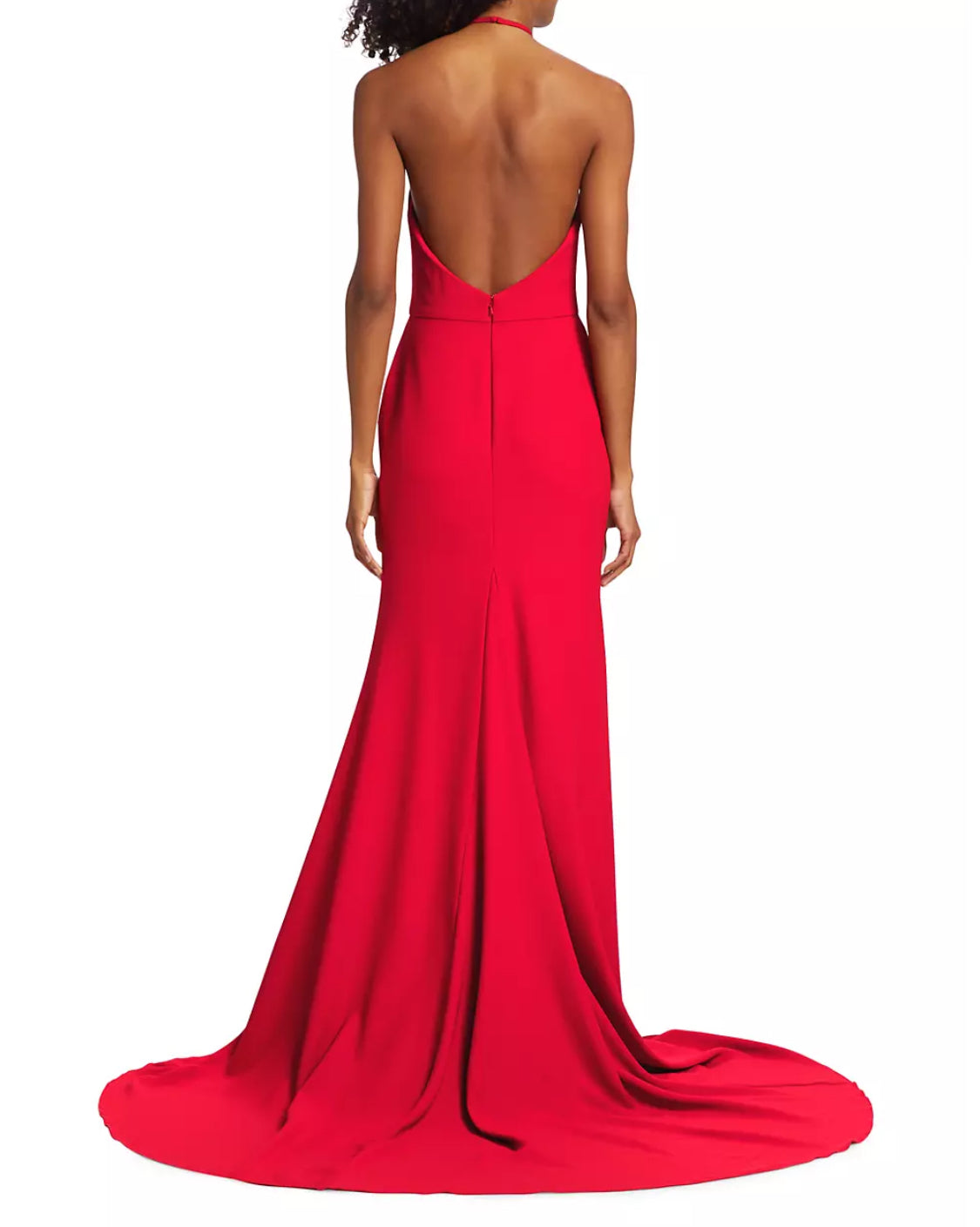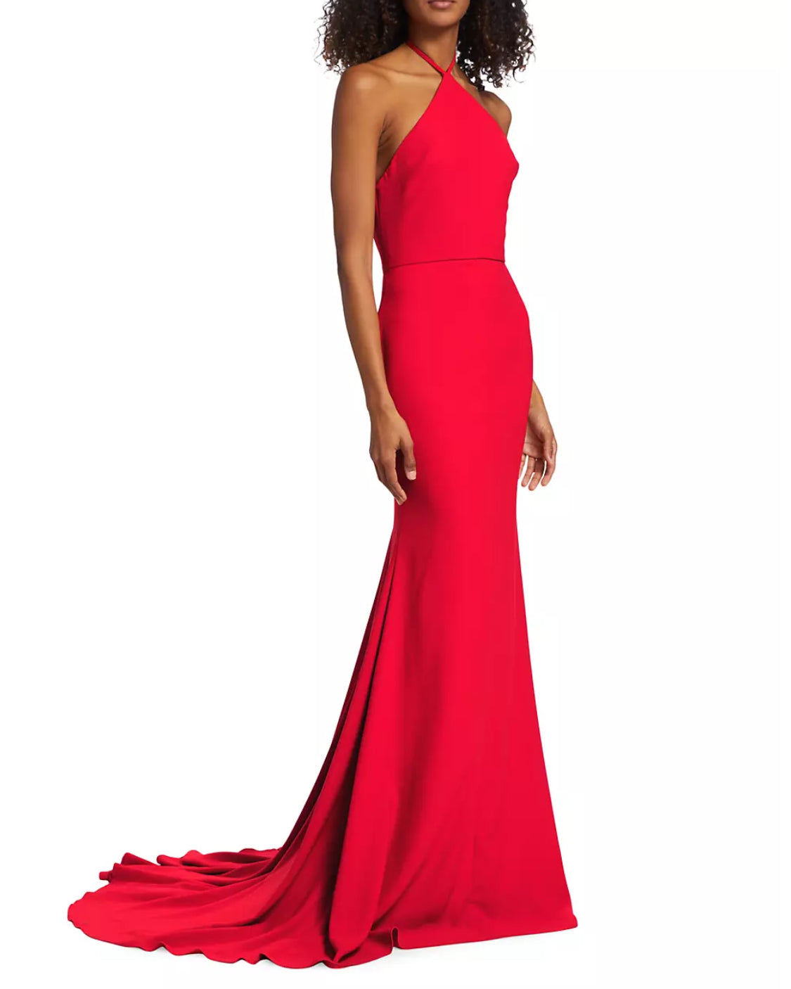 Experience timeless elegance with Vera Wang Bride's Madra gown. This mermaid silhouette, crafted from smooth crepe, features a clean halter neck and a dramatic train, offering a refined and sophisticated look perfect for any bride seeking classic beauty with a modern touch .