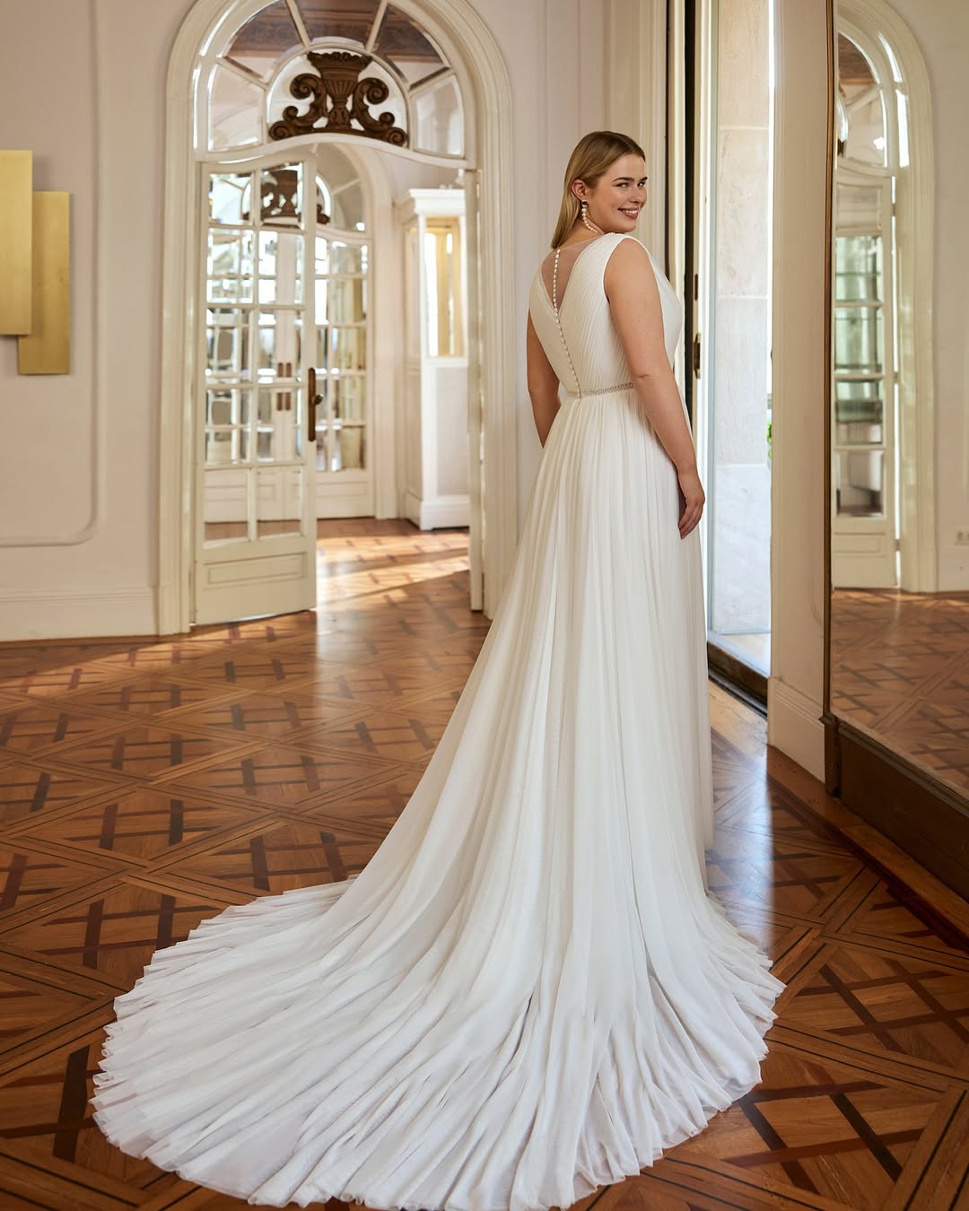 Welina captures timeless elegance with its graceful A-line silhouette and delicate V-neckline. Crafted by Rosa Clara Martha Blanc, this ethereal gown features a flowing tulle skirt that moves beautifully with every step. Perfect for the bride seeking understated sophistication and romantic charm on her wedding day.