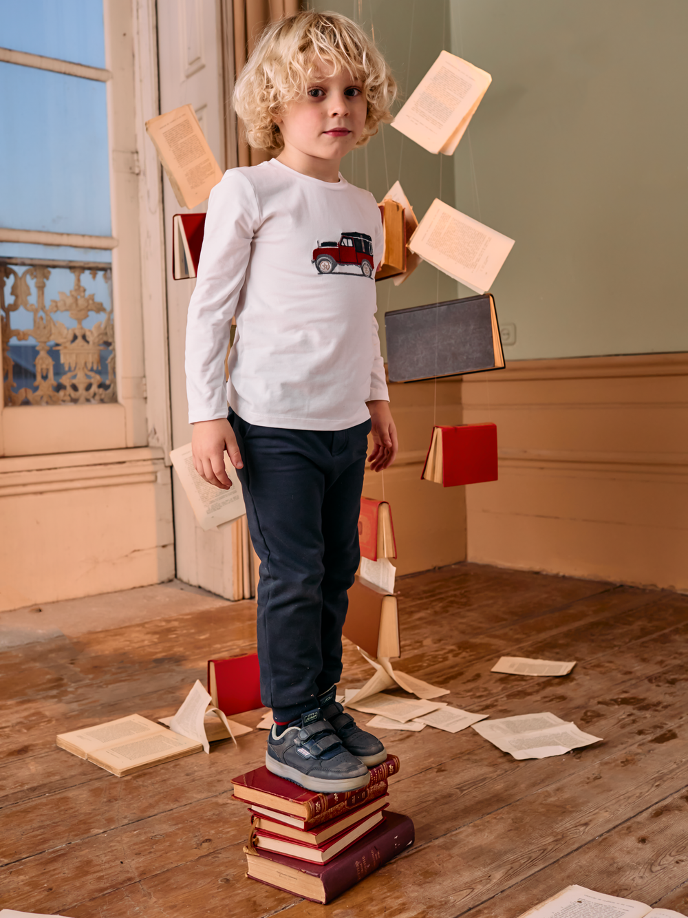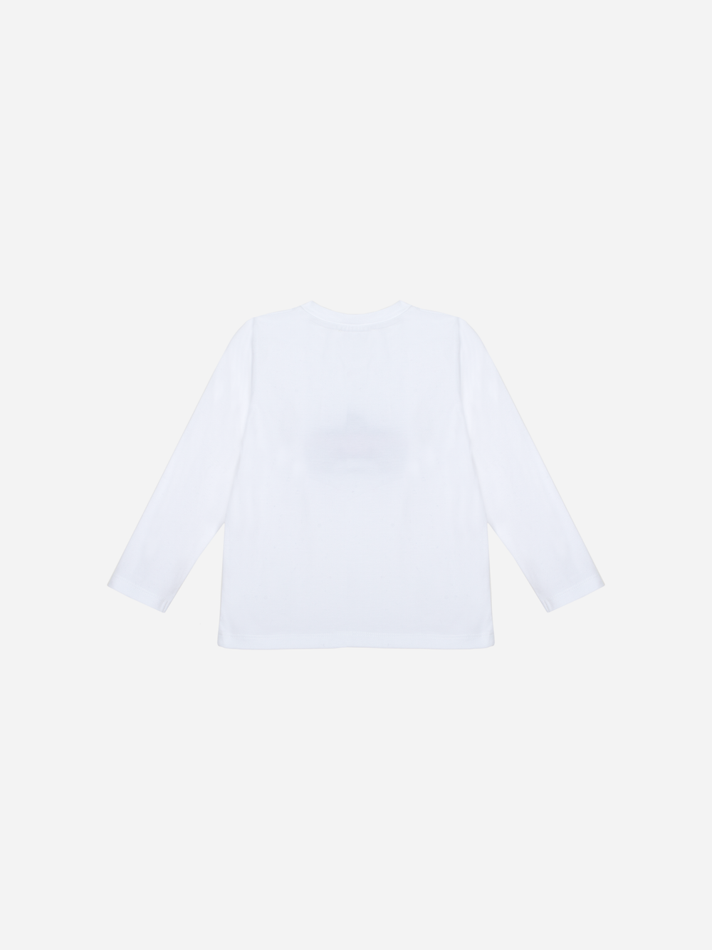 This soft white long-sleeved t-shirt is made from comfortable jersey fabric. It features a charming embroidery of a classic red car on the chest. Convenient button closures on the shoulder make dressing easy.